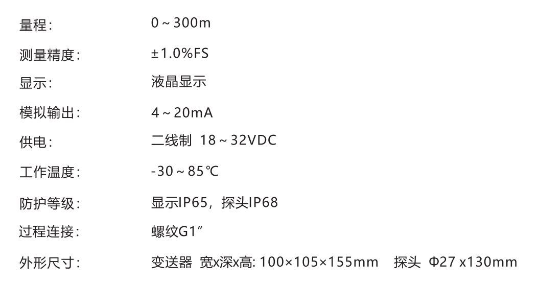 產(chǎn)品簡介: 靜壓液位計(jì)GLL300的功能特點(diǎn)有:可直接投入到液體中測量液位;結(jié)構(gòu)精巧、安裝、使用方便、免維護(hù);原理簡單、測量準(zhǔn)確、抗干擾能力強(qiáng);穩(wěn)定性好、靈敏度高;防水、抗結(jié)露設(shè)計(jì);結(jié)構(gòu)緊湊、堅(jiān)固、重量輕