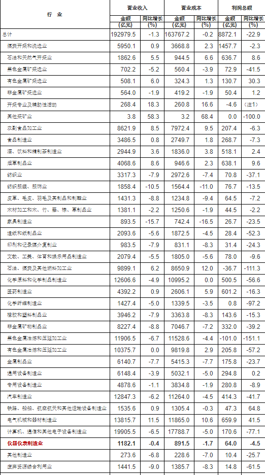 3月27日,國(guó)家統(tǒng)計(jì)局發(fā)布了2023年1-2月全國(guó)規(guī)模以上工業(yè)企業(yè)利潤(rùn)增長(zhǎng)狀況。1—2月份,全國(guó)規(guī)模以上工業(yè)企業(yè)實(shí)現(xiàn)利潤(rùn)總額8872.1億元,同比下降22.9%。其中,1-2月全國(guó)規(guī)模以上儀器儀表制造企業(yè)實(shí)現(xiàn)利潤(rùn)總額64.0億元,同比下降4.5%。