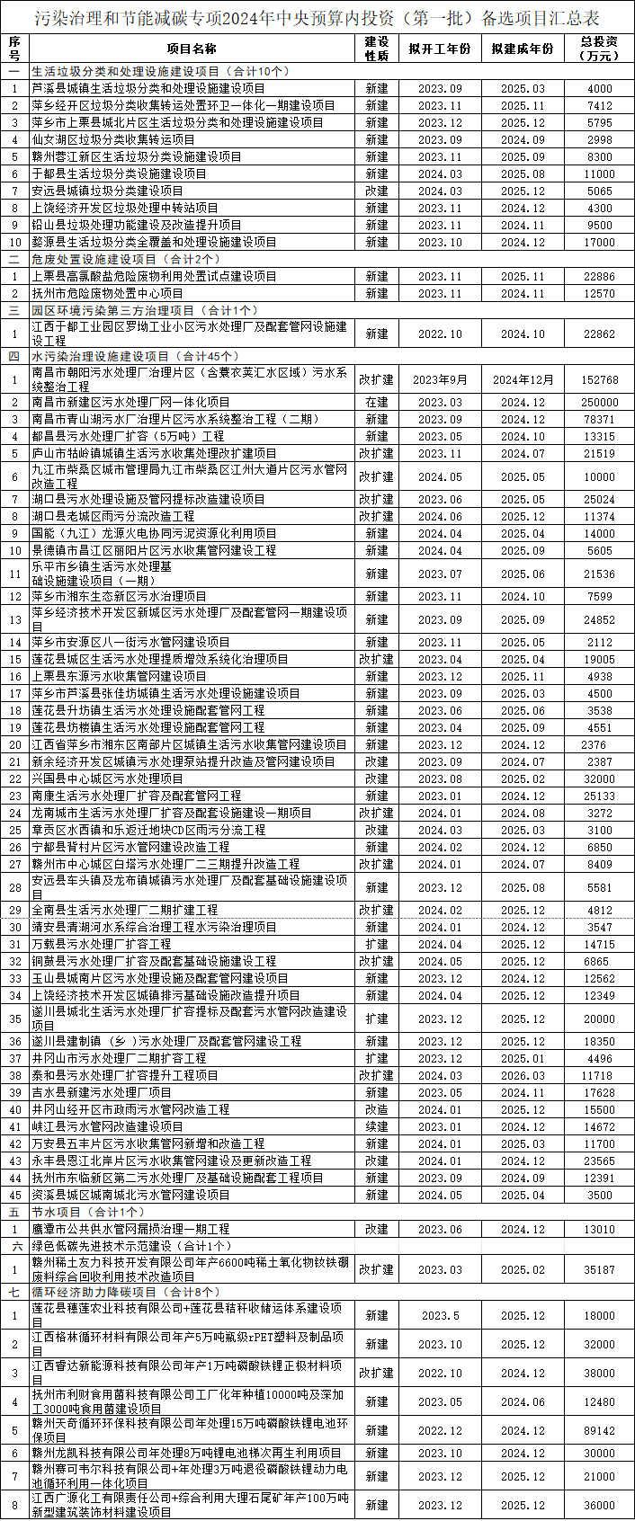 江西省發(fā)展改革委關(guān)于污染治理和節(jié)能減碳專項(xiàng)2024年中央預(yù)算內(nèi)投資(第一批)備選項(xiàng)目的公示,經(jīng)初審、第三方組織專家評審、行業(yè)部門聯(lián)審,擬推薦備選項(xiàng)目68個(gè),包含生活垃圾分類和處理設(shè)施建設(shè)項(xiàng)目(合計(jì)10個(gè)),危廢處置設(shè)施建設(shè)項(xiàng)目(合計(jì)2個(gè)),園區(qū)環(huán)境污染第三方治理項(xiàng)目(合計(jì)1個(gè)),水污染治理設(shè)施建設(shè)項(xiàng)目(合計(jì)45個(gè)),節(jié)水項(xiàng)目(合計(jì)1個(gè)),綠色低碳先進(jìn)技術(shù)示范建設(shè)(合計(jì)1個(gè)),循環(huán)經(jīng)濟(jì)助力降碳項(xiàng)目(合計(jì)8個(gè))。